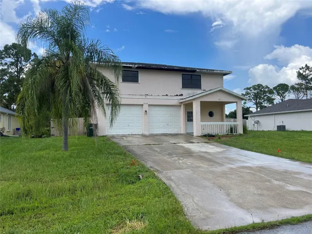 Attention my fixer up peeps! This two story unique North Port Home Features a good sized room on first floor and a bath and laundry facilities. Wall AC. Would make a great teen hideaway or home office or craft area. Slider overlooks the pool! Second story features living room, dining area, two bedrooms and a bath. There is a huge attached garage with back garage door access also! The house has siding issues. Can be cut away and repaired but seller thought best to sell as is. Caged pool with some prior storm damage but fixable. Fully Fenced yard. New in 2023.